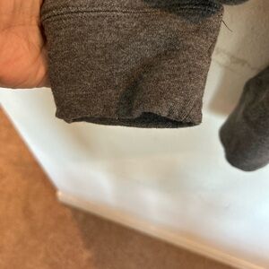 This is a sweat shirt that is gray and has a sweater cowl neck with drawstring closure .