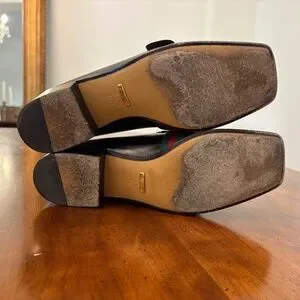 Gucci Black Leather Loafers with Gold and Green-Red Stripe Webbing, 37.5