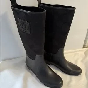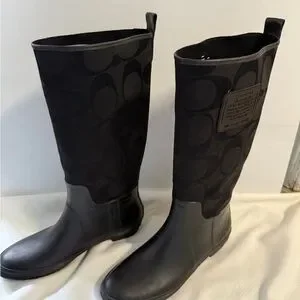 Stylish black boots by Coach. Ideal for winter. Features a subtle pattern.