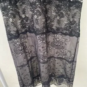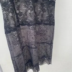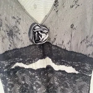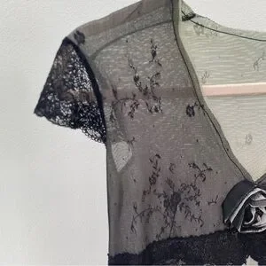 Dainty black lace and mesh v-neck dress featuring rosette at the bust and sheer lace cap sleeves. Excellent condition! Women’s size small to medium