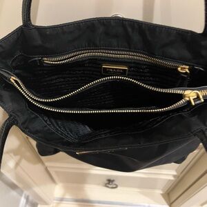Sleek Prada tote in black. Features durable nylon material. Perfect for everyday use.