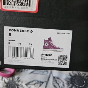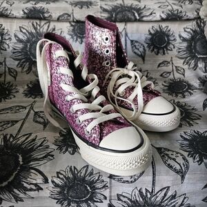 Stylish pink high-top sneakers by Converse. Features a unique speckled design.