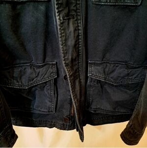 Stay stylish and warm with this Hollister men's dark blue jacket. Perfect for any occasion, this jacket combines comfort and fashion effortlessly. lots of pockets. really good overall condition. does have 2 broken (but functional) buttons on top two pockets. see photos. buttons are hidden so you won't see while wearing. some wear on one cuff. see photo. super soft. great jacket