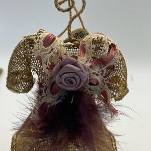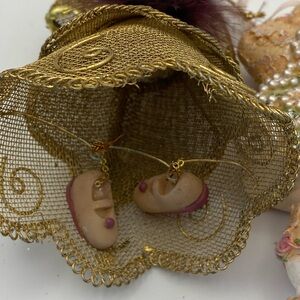 Two Vintage Victorian style dress form ornaments. One with gold tone mesh skirt, feathers and floral accents. See the dangling feet under the skirt? The other a resin figure has lace, faux seed pearls with pink roses and green leaves. So intricate. Both vintage, previously owned. Handle feathers with care. See photos for any wear and tear.