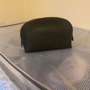 Sleek black leather pouch by Coach. Features gold logo detailing. Small, but great to carry lipstick, mascara etc.