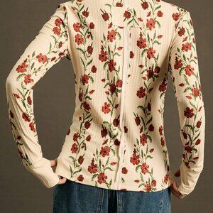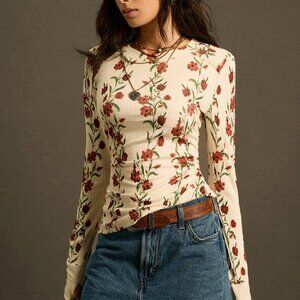 Apricot Boho Women's Elastic Ribbed Long Sleeve T-Shirt w/Floral Cinched Waist