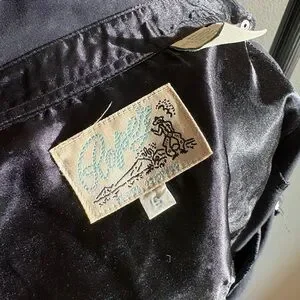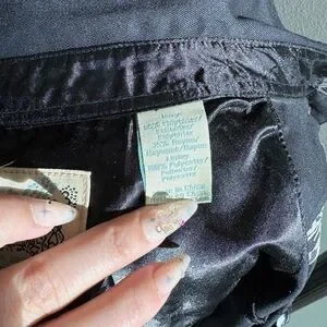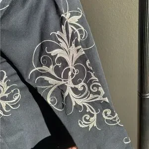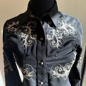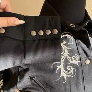 Stylish black button-up shirt featuring elegant beige embroidery, perfect for shows! In perfect condtion with unique buttons!
