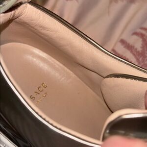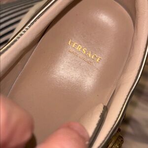 Elevate your look with these shiny silver sneakers. Versace design with sleek style. Size 37.5
