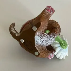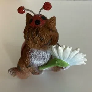 Adorable cat figurine holding a red ladybug and a white daisy. Perfect for decoration. Measurements In Photos
