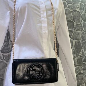 Authentic GUCCI SOHO Interlocking G Patent Leather Zippy Wallet in preowned condition with normal signs of wear may include rub or fade to edge. Some restoration minor imperfections maybe noted. Zipper works great. Very spacious inside with large zip pocket . Will fit your cards, cash, cell phone and some accessories.