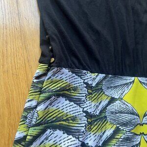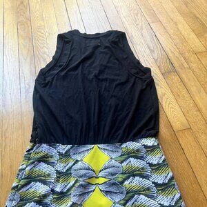 geometric dress, pencil dress, sleeveless dress, blouson dress, v-neck dress, fitted skirt, above the knee dress, cocktail dress, office dress, party dress, designer dress, modern style, black yellow, statement dress, luxury dress, indie dress, snakeskin print dress, animal print dress, bohemian dress, Nicole Miller dress, size 8 dress, luxury dress