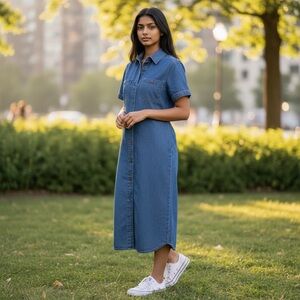 Stylish midi denim dress by Liz Claiborne. Features a button-down front and short sleeves. 100% cotton. Ideal for casual wear.