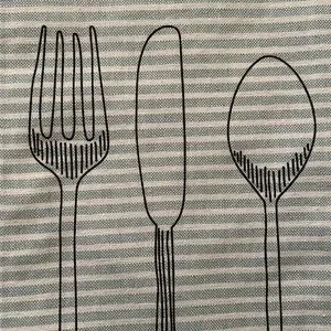 With cute pattern of thin outlines of a fork, knife, and spoon in black