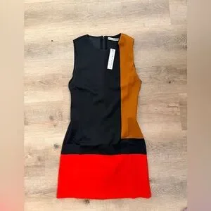 Elegant sleeveless mini dress with bold black, orange, and red color blocks. Perfect for a modern, chic look.