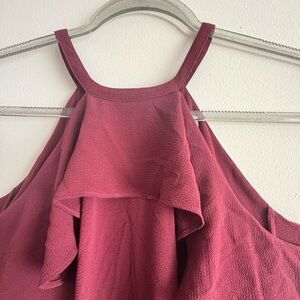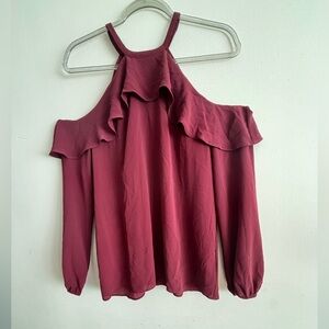 Chic burgundy blouse with ruffle details. Cold-shoulder chiffon design adds elegance. Used excellent condition. Measurements in the pictures.