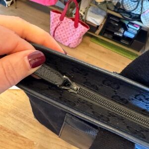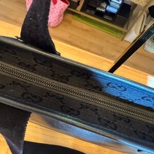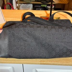 Beautiful preowned black Gucci canvas tote. Tote is in overall very good condition. No stains holes or tears. Inside is very clean. Zip top closure.