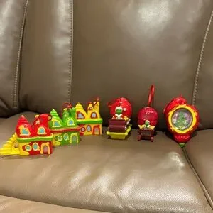 Bright and fun set of ornaments from Dr. Seuss’s How the Grinch Stole Christmas collection. The three who houses have picture viewers in them.