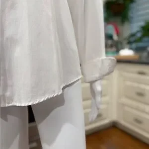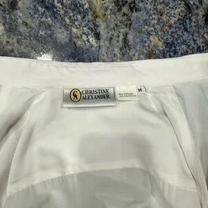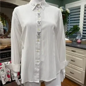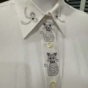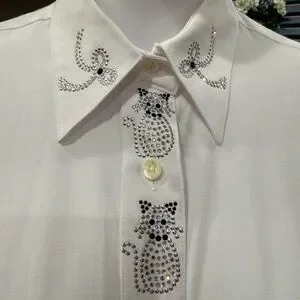 Christine Alexander Elegant White Cat and Bow Rhinestone Button Down Blouse M