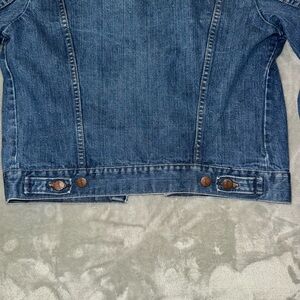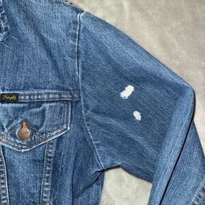 Stylish Wrangler jacket in light blue denim. Features button closure and chest pockets.