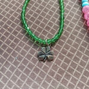 1. Sterling shamrock, with bohemian glass beads, non sterling clasp, 10 inches. maybe an anklet or for a doll or teddy bear or for parts. marked 925 on charm.