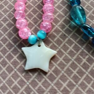 2. Plastic pink beads wiyh blue fiberoptic beads with shell white star pendant, approx 18 inches, with sterling clasp.