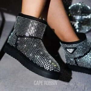 NIB Twinkle Faux Fur Lined Slip On Winter Ankle Boots Black Iridescent Rhinesto