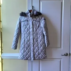 Vintage ladies Guess los Angeles grey quilted parka with faux fur removable hood. Polyester fill. Excellent condition. Non smoking home