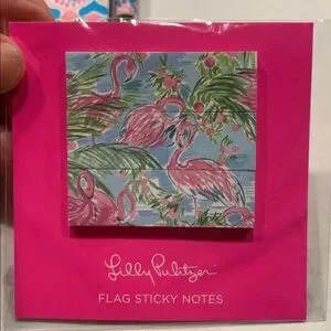 Lilly Pulitzer Pink Flamingo journal, sticky notes, and writing pen
