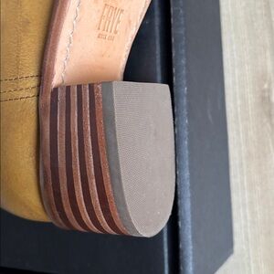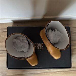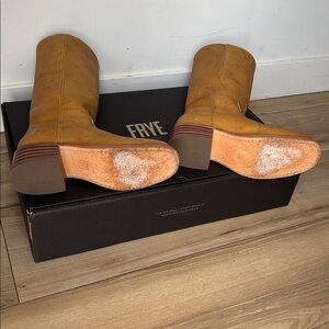 These are a beautiful pair of basically new Frye Campus 14L boots in the color Banana, size 8.5. As you can see from the pictures of the heel, I barely worn these one time. They are in perfect condition. I still have all of the packaging inside so they don’t get squished and have the original box.