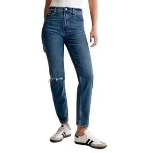 Keywords: high waist, distressed, ripped knee, blue denim, casual, everyday, comfort, modern