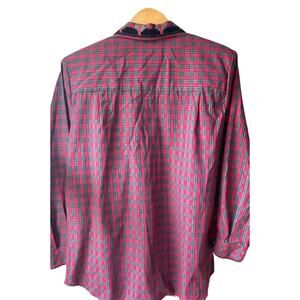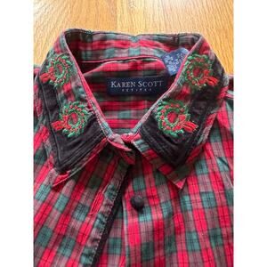 Vintage Karen Scott Petites plaid button-down shirt, size Petite Small. Early-2000s piece featuring classic red and green plaid with embroidered holiday wreath details along the collar. Button-front design with long sleeves and a structured yet easy-to-wear silhouette.