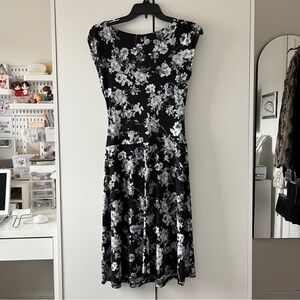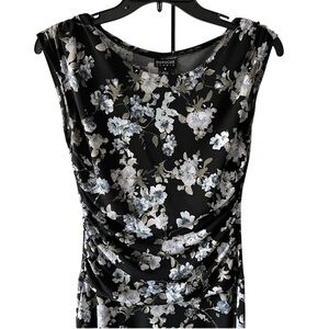 Vintage floral ruched dress with a classic fit and flare silhouette, size 8 but fits like a modern small | Blue and white blossom print on black, flattering side ruching, and a midi length for true 90s/Y2K cottagecore or romantic aesthetic