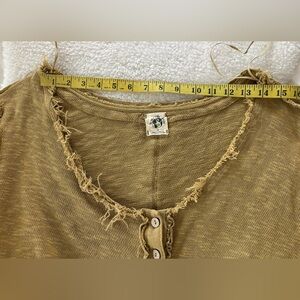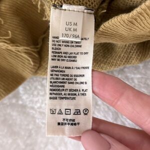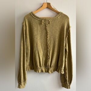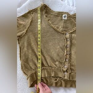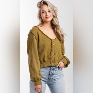 Stylish olive green button-up sweater with frayed edges. Perfect for casual wear.