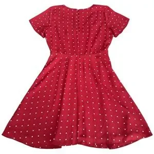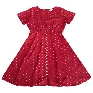 Whimsical charm takes center stage with this delightful dress, perfect for adding a touch of playful sophistication to your wardrobe. A vibrant red backdrop is adorned with classic white polka dots, creating a look that's both timeless and eye-catching. The flattering V-neckline and button-front design add a touch of vintage flair.