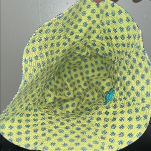 Charming hat with floral design. Features green and teal colors. A vibrant paisley-patterned bucket hat by Vera Bradley, featuring a mix of teal, yellow, and white colors. The hat is quilted, providing a unique texture and style.