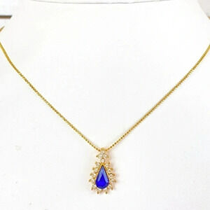 Stunning Nina Ricci signed NR, minimalist blue crystal teardrop pendant with elegant sparkling, clear rhinestone halo. The chain is the daintiest gold rope chain with such lovely shine, measuring 18 inches long and closes with a lobster claw clasp. The pendant measures