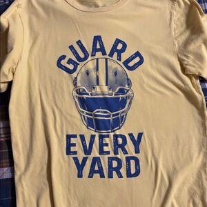 Bold graphic tees from Place. Yellow tee with 'Guard' and helmet design. Navy tee with football and geometric pattern. Perfect for sporty kids.