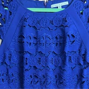 Striking Antonio Melani cocktail dress in a bold cobalt blue. Features modern laser-cut detailing that adds texture and interest, paired with elegant cap sleeves for a polished, flattering silhouette. Ideal for cocktail parties, weddings, date nights, or special events.