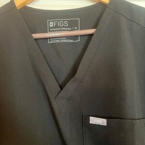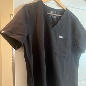 Sleek black scrub top by Figs. Features a V-neck and chest pocket. Ideal for healthcare settings.