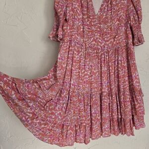 KARLIE Layered Ruffle Hem Puff Sleeve Pink Orange Dress, M