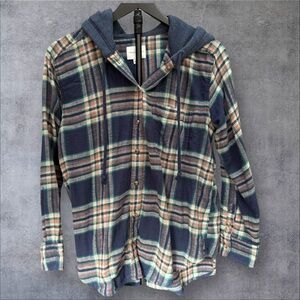 American Eagle Outfitters Multicolor Blue Plaid Flannel Hooded Button Women’s S
