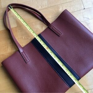 The perfect sized tote…not too big, not too small! Awesome pebble faux leather in universal tan with a striking black vertical center stripe on the front. Open top with one interior pocket. Some wear on the corners and extra sewn threading seen on one handle. Great everyday or backup bag with lots of life left for any season of the year. Chic, modern, classic. 😍 From Vince Camuto.
