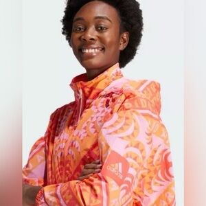 The Adidas Women's × FARM Rio MYSHELTER Jacket in Semi Pink Glow Tomato Soccer is a stylish and colorful jacket made from nylon with a floral pattern. It features a relaxed fit with long sleeves, a zip closure, and a hood for added protection. The jacket is machine washable and has pockets for convenience.