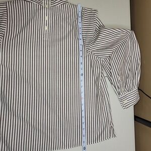 The Everlane Long Sleeve Shirt Top in Brown Striped is a stylish and versatile addition to any woman's wardrobe. Made from lightweight cotton fabric, this relaxed fit blouse features a mock neck with a button closure, perfect for a casual occasion. The oversized and woven design adds a touch of flair to this wardrobe staple, suitable for wearing in the summer, fall, or spring seasons. With its classic style and quality brand, this top is a must-have for women looking for a comfortable and fashionable option.