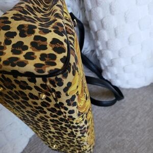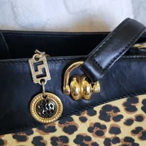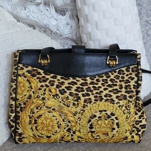 Beautiful Leopard pattern Gianni Versace,, like new condition, canvas in Exelent condition, leather in pristine condition, handle straps like new,, no callouts at all,, very chic and classy..rare to find on this condition... This stylish women's bag features a striking black and gold design, perfect for adding a touch of elegance to any outfit. The intricate pattern and high-quality materials make it a must-have accessory.