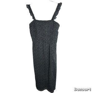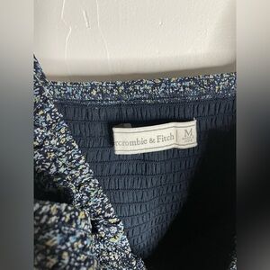 Abercrombie & Fitch Ditsy Floral Smocked Midi Dress in navy. Ruffle straps and side slit.