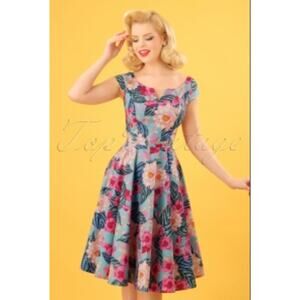 Hell Bunny Retro Tropical Floral Fit and Flare Dress Blue Pink Size S