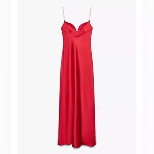 This striking red dress from Zara features a sleeveless design with delicate spaghetti straps and a flattering sweetheart neckline. Perfect for a cocktail night out, its slip style offers a sleek and minimalist silhouette, making it an elegant choice for any evening occasion.