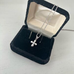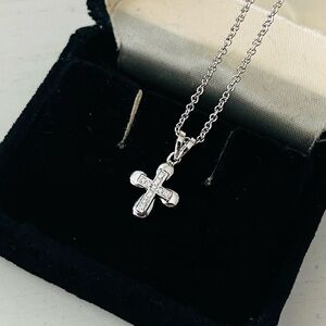 This elegant small white gold cross pendant necklace is perfect for any occasion, gift or for daily wear. White gold stamped chain and white gold cross. Ten natural fully cut small diamonds with the center one being a tad larger. 6 diamonds vertically in the cross and 5 horizontally with the center stone being included in both counts equaling 10 diamonds total. Beautiful dainty adult necklace or nice gift for baby or a little girl too