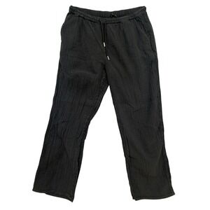 Quince Organic Cotton Gauze Straight Leg Pants in black size large. These pants offer a comfortable elastic waistband with a drawstring closure for a customizable fit. The textured gauze fabric provides a lightweight and breathable feel, while the straight leg silhouette ensures a classic look. Side pockets add practicality and convenience.